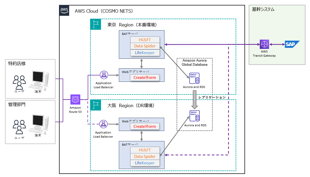 従来のデータセンター環境において冗長構成とはしていたものの、災害発生時に広域でシステムを切り替える仕組みは整っていなかった。今回は、AWSの東京リージョンと大阪リージョンにシステムを構築し、BCP(事業継続計画)が可能なDR(災害復旧)体制とした。何時間以内に切り替え可能か、どの時点までデータを復旧できるか、明確な目標を設定したうえでインフラ設計を行い、システムの信頼性を飛躍的に向上させた。