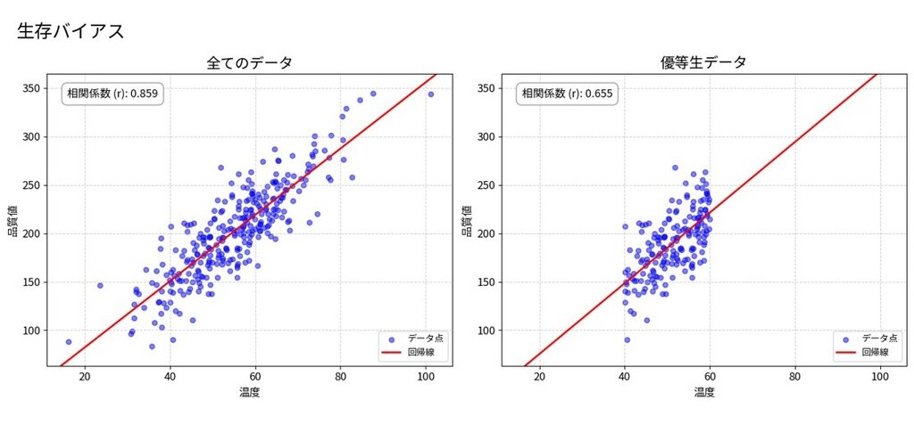 データセットに「全てのデータ」が含まれているとは限らない。例えば、後工程の品質検査データと前工程の温度データの相関を見る際、前工程ですでに明らかな不良として廃棄された製品のデータが含まれていないケースがある。バラツキの大きなデータこそが相関を形成するのに、それらが除外された「優等生データ」だけで分析を行えば、相関が見えなくなるのは当然だ。