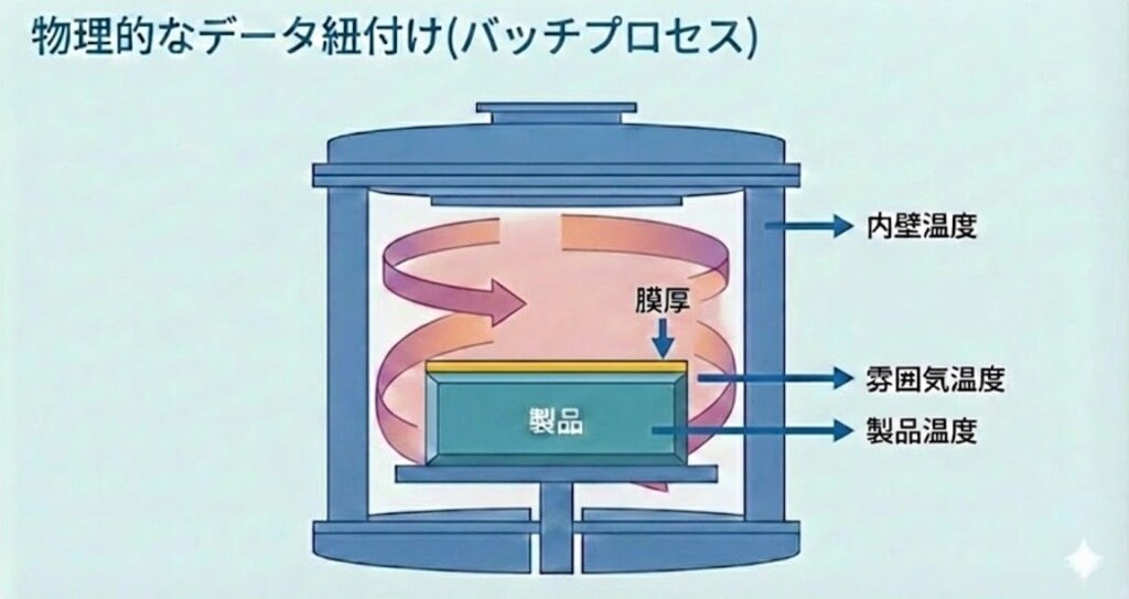 下のようなバッチプロセスにおいて、要因系データの候補として製品温度、内壁温度、雰囲気温度、結果系データの品質値として膜厚との相関関係を調べたい場合、3つの散布図を描くだけでなく、それぞれについて、何を測定した温度なのか、どの場所を測定した温度や膜厚なのか?を理解する必要があるということだ。