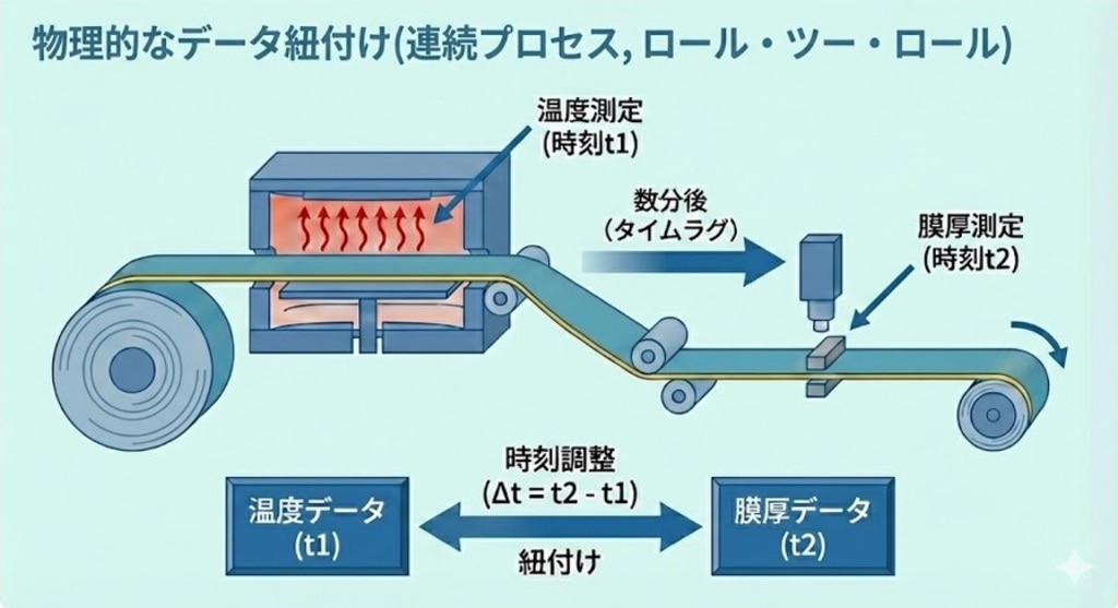 下は連続プロセスの1つであるロール・ツー・ロールの概念図であるが、温度測定をした時刻と膜厚測定をした時刻にはタイムラグが存在する。データを紐付けするにはこれらの差分を調整する必要がある。