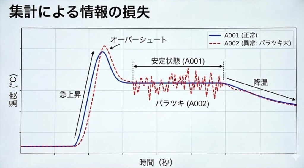 平均化は、温度のスパイクや振動といった重要な特徴量を消失させる。平均ではなく、最大値、最小値、あるいは標準偏差など、変動の特徴を捉える集計方法を選択すべきだ。