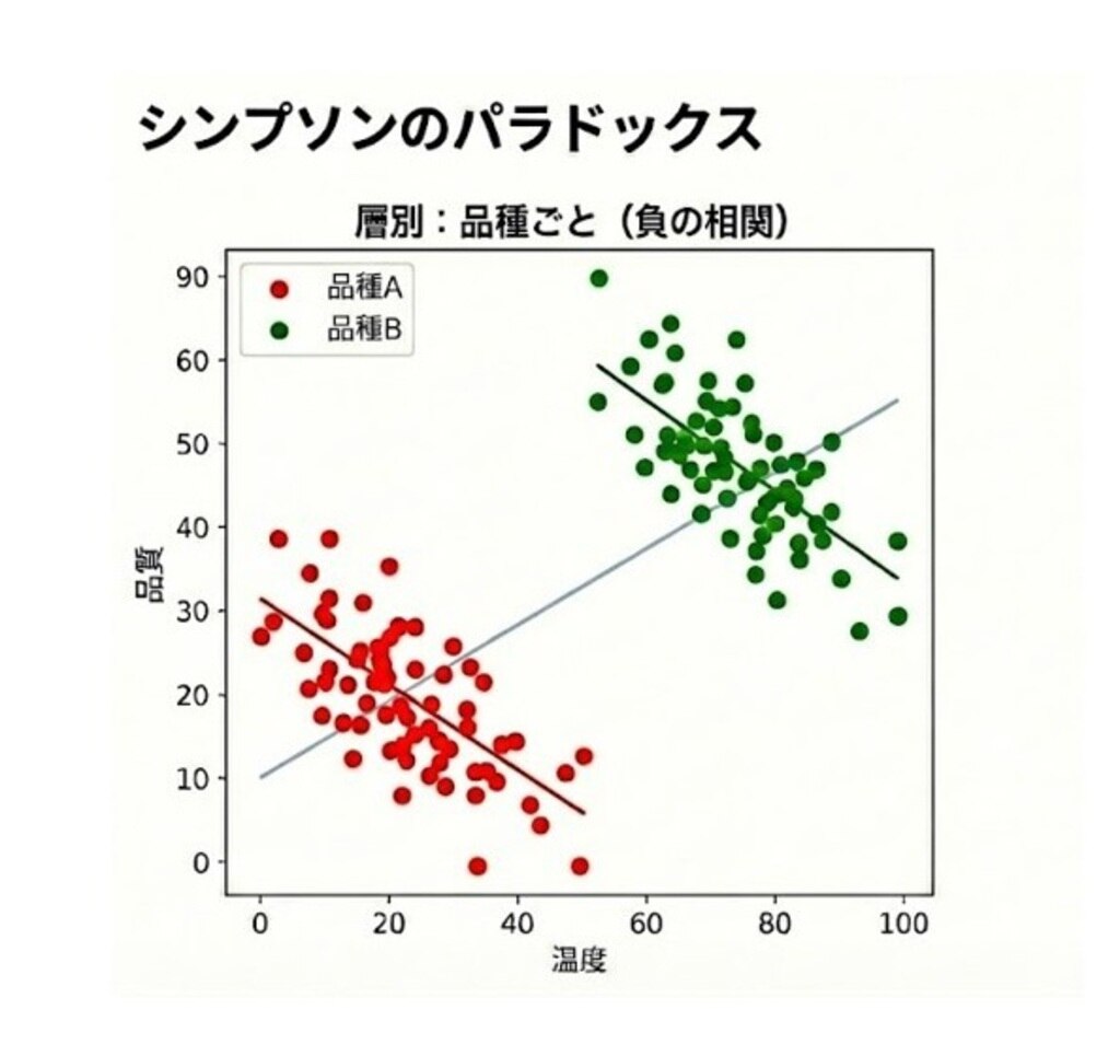 シンプソンのパラドックスとは下のグラフのように、全体データで見ると「温度が上がると品質が上がる」という正の相関があるのに、品種ごとに層別してみると、全ての品種で「温度が上がると品質が下がる」という負の相関になっている現象だ。