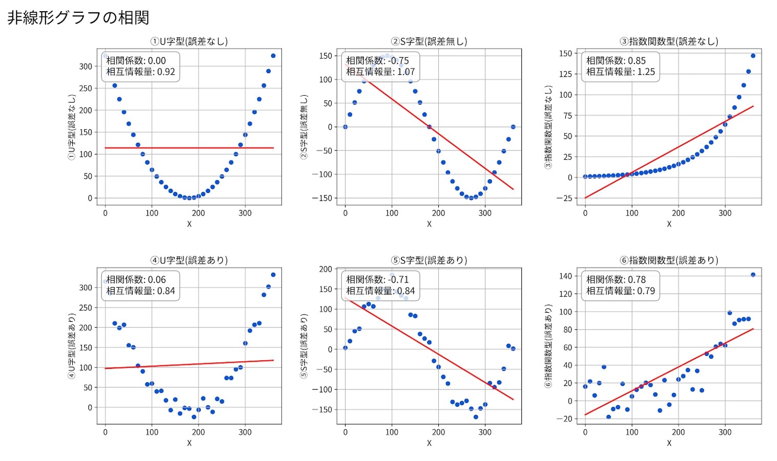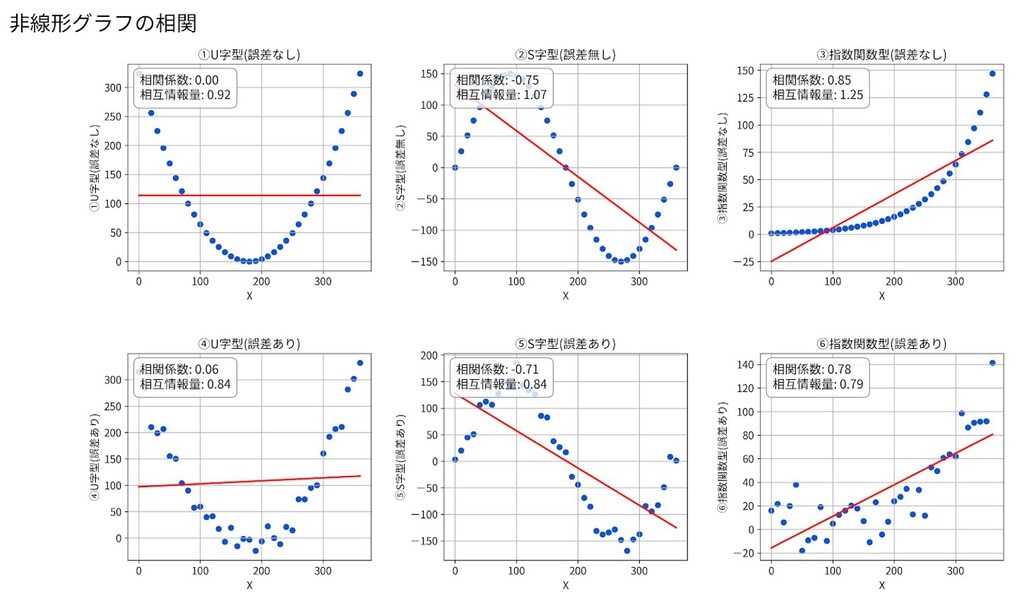 散布図がU字型やS字型を描いている場合、ピアソンの相関係数はゼロに近くなるが、非線形な関係性も捉えられる「相互情報量(Mutual Information)」などの指標を用いるべきだ。