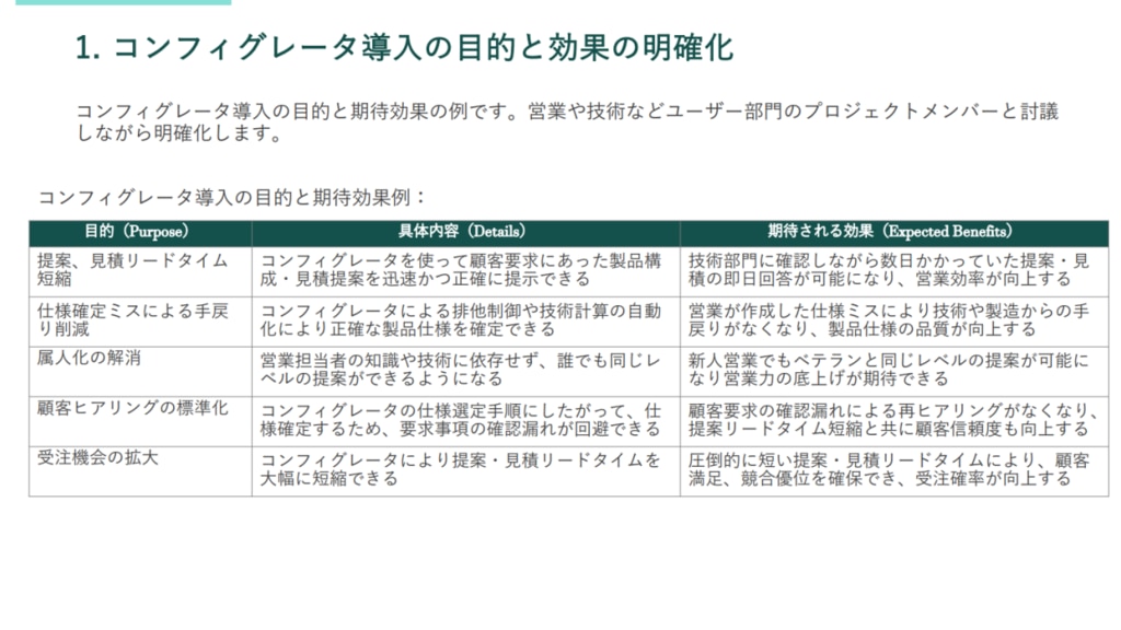 BtoB製造業におけるコンフィグレータを活用した営業改革を実現する手順について解説しています。 この手順書では設計者の仕様確定プロセスを形式知化し、ルールとして整備していくステップも記載しています。コンフィグレータ導入検討の参考にしてください。