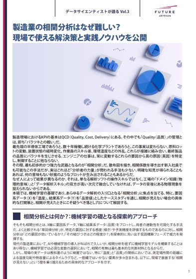 Vol.1、Vol.2に続き、本稿では機械学習の基礎であり、あらゆるデータ解析の入り口となる「相関分析」に焦点を当てる。特に、要因系データ(X)を「温度」、結果系データ(Y)を「品質値」としたケーススタディを通じ、相関が見えない場合の具体的な打開策と、相関が見えたときにこそ疑うべき落とし穴について解説する。