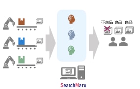 「SearchMaru」は、検査装置から製品の撮像画像または検査画像を取り込み、AIで自動的に不良の種別ごとに画像を分類します。この分類結果に基づきリアルタイムでの不良検知が可能となります。さらに、分類結果と実績データやプロセス値などと紐づけることにより、不良の要因解析を実現します。